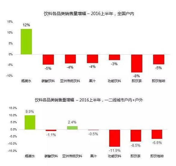 据凯度消费指数数据显示,今年上半年饮料整体销售量下跌了5%,各大品类无一幸免,碳酸饮料、果汁、即饮茶跌幅在5%到8%不等,这两年表现强势的功能饮料和亚洲传统饮料也分别下跌4%和3%,但值得关注的是,在整体饮料市场下滑的环境下,这个品类却逆势上扬!
