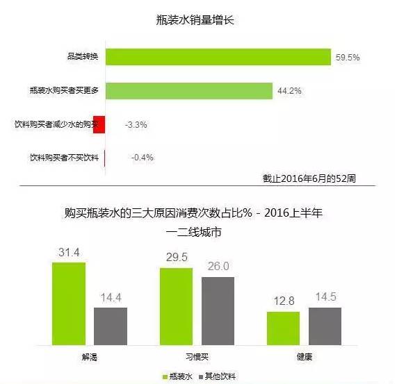 凯度消费指数全国家庭样本组数据显示,今年上半年全国户内瓶装水的销售量上涨12%,继续保持双位数的健康成长,而一二线城市户外消费样本组的数据也显示,瓶装水户外销售量涨幅也高达7%,瓶装水市场销售量整体增长高达10%。