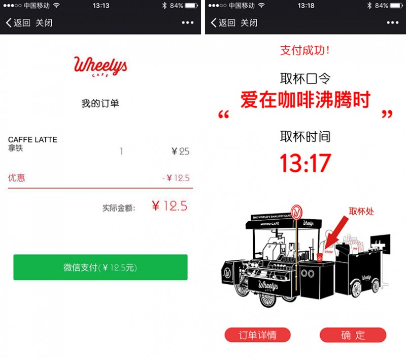 在中国,购买Wheelys咖啡主要采用微信端下单的方式(Wheelys在微信端的开发值得大书特书)。消费者选择附近的网点,下单后可直接到店拿走咖啡,这样的流程对于快节奏的人群来说会比较方便——尤其是在早上上班等人员密集流动的时间段。