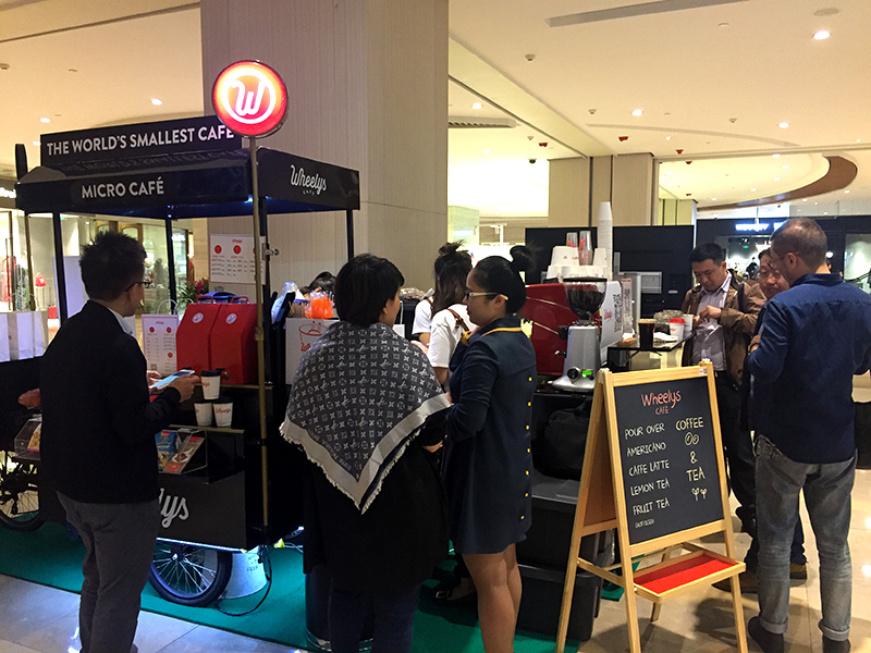 算起来的话,因为主要以租用的方式而不需要买车和很多硬件设备,中国的运营者如果要加盟门槛并不算太高,我们在拿咖啡的现场不长的时间里就遇到前来咨询招募计划的人,前期的传播还是很有效果的。而如果简单算个账,Wheelys的咖啡及茶饮的价格15至35元不等,嘉里中心店一天大概能卖出150杯,以中间价计算,一天的营业额也能达到3700元,这是刚起步的数字。