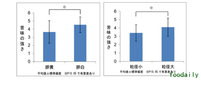 之后还在青椒汁中加入了只有乳化状态具有差异的蛋黄型蛋黄酱,进行了感官评价。假定“粒子的大小=乳化状态”,比较粒径差异较大的“手工蛋黄酱(粒径大)”及“工厂产蛋黄酱(粒径小)”,发现小粒径组降低苦味的效果出现了显著性提高。