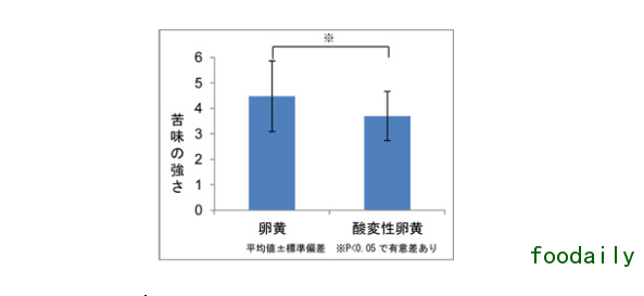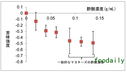 感官评价结果为与普通蛋黄相比,酸变性蛋黄对苦味的降低有显著效果,从味觉认知装置实验结果可知,在蛋黄酱中加入醋的浓度越高,对苦味的抑制效果越明显。以上实验结果表明,苦味降低效果与“蛋黄”的大小相关,通过将蛋黄酱中含有的蛋黄进行均一乳化,和醋混合使之变性,可进一步提高其对蔬菜苦味的抑制效果。