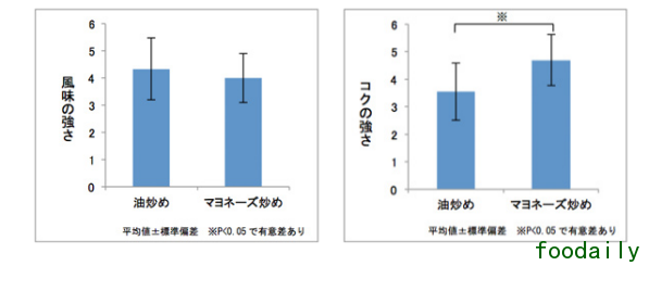 研究内容为炒制蔬菜(卷心菜),分别制作加盐(盐含量0.5%)调味的食用油炒菜及加入蛋黄型蛋黄酱替代油,以调味蛋黄酱(盐含量0.16%)进行炒制的样品。食用同样量的炒菜评价其风味的强弱及味道的浓淡。