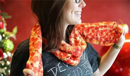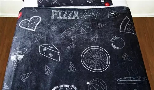 除了印着“PIZZA”字样的服饰与印着披萨、奶酪、水果、洋葱等简笔图案的枕套、被单稍显简约外,印满彩色披萨的滑板、帽檐看起来就像一块火腿披萨的帽子还有可以说是难以直视的披萨围巾等,都制作得十分逼真。