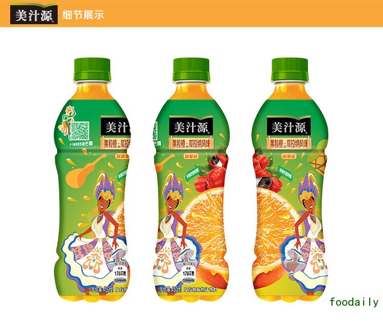 美汁源果粒橙于 2005 年在中国上市。目前美汁源有果粒橙、葡萄、红葡萄、冰盐柠檬、雪梨、苹果、芒果和热带(果粒)等 8 个口味。前不久美汁源还推出了推出了果粒橙的瓜拉纳风味(最新的混合果汁似乎让美汁源和它的竞争对手百事的“果缤纷”走得更近了)。除此之外,果粒奶优也是美汁源旗下的一条产品线。