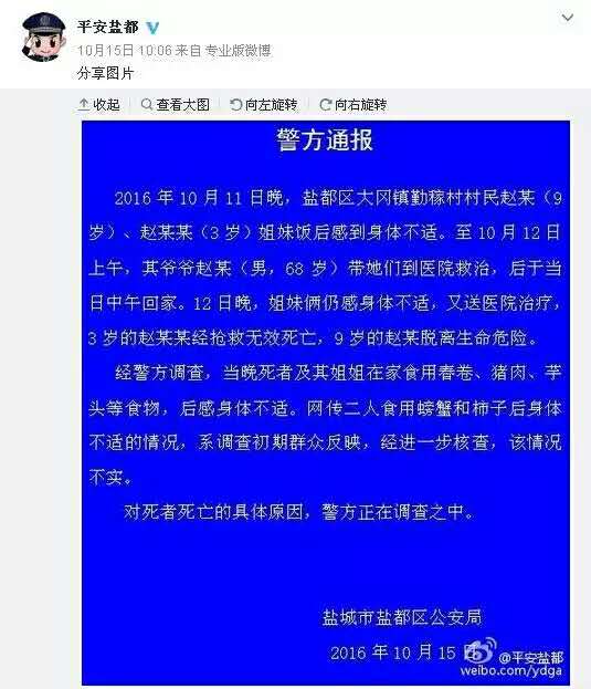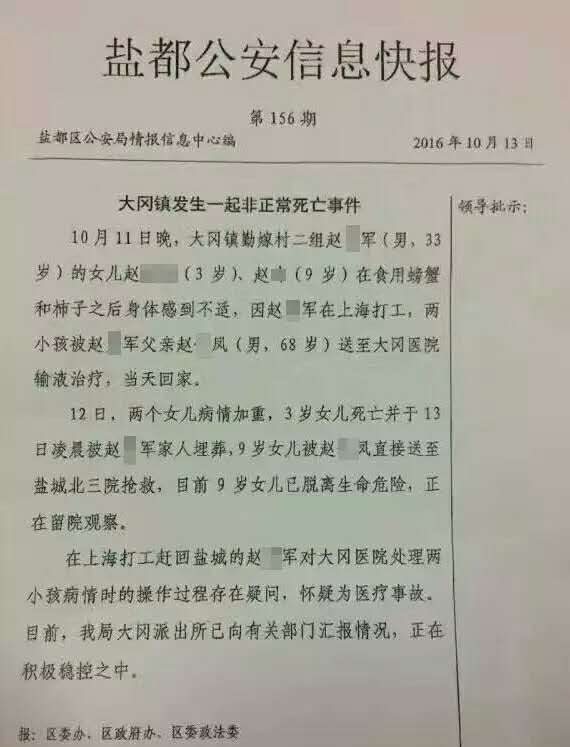 据盐城市盐都公安局报道,10月11日晚,大冈镇勤嫁村二组赵某,3岁的小女儿和9岁的大女儿在食用螃蟹和柿子之后身体感到不适,因赵某在上海打工,两小孩被孩子的爷爷送至大冈医院输液治疗,当天回家。12日,两个女儿病情加重,3岁女儿死亡并于13日凌晨被赵家人埋葬,9岁女儿被孩子爷爷直接送至盐城北三院抢救,目前9岁女儿已脱离生命危险,正在留院观察。