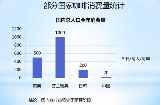 中国咖啡市场还只是处于萌芽阶段,我国的咖啡年消费量仅为20万吨。从绝对数量上看,中国咖啡总量远不及西方国家,但是从发展角度来看,中国成为世界上最具潜力的咖啡消费大国,到2020年中国人人均每天喝一杯咖啡的话,仅咖啡豆市场每年将达到500亿美金,整个产业链将产生上千亿美金的市场。