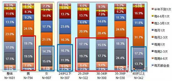 以连锁咖啡馆为例,就年龄而言,25-39岁消费族群去连锁咖啡专卖店消费的积极性远高于其他年龄段。而从男女消费比例来看,男性就远高于女性,到连锁咖啡专卖店消费的男性消费者中,每周至少会去一次的比率占了近五成,远高于女性(三成五)。(如下图所示)