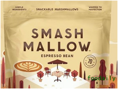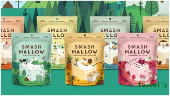 SMASHMALLOW棉花糖方块,口味包括烤椰子菠萝味、Meyer柠檬奇亚籽味,装在一个可以重复密封的袋子里(建议零售价为每包3.99美元,每包重量为4.5盎司),设计作为每日的零食,将于本周在Sprouts商店里初次登台。