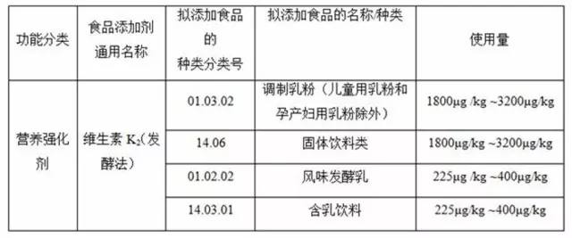 拟申请的维生素K2(发酵法)的功能分类、用量及使用范围
