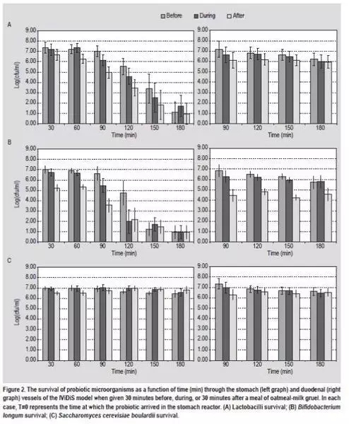 从表中我们可以清楚看见非特殊剂型益生菌(Non-microencapsulated probiotics)在饭前30分钟或与饭中使用,其存活率较高,饭后30分钟使用其存活率最低。