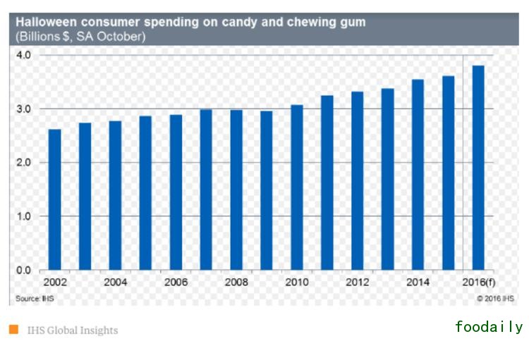 咨询公司 IHS 的最新报告预测了今年万圣节糖果花销自 2011 年以来的最大增幅 5.5%,达到了 38 亿美元。平均每个家庭会花 30.6 美元为“不给糖就捣乱”买单。糖果销量也可能达到五年来最高。报告数据基于十月人均糖果和口香糖花销,并经过了季节性调整。