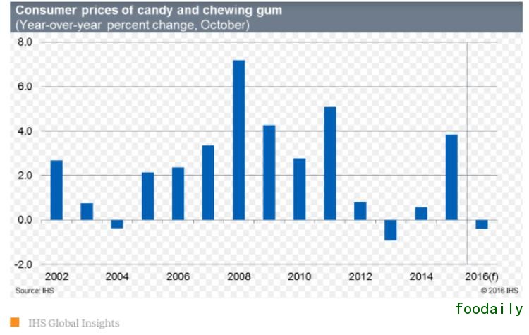 不过去年的高数据有很大程度上来源于大幅度的涨价。糖果价格在经历了稳定的 2012 - 2014 年后突然提升,与去年全球市场原糖、精糖和美国可可粉的涨价不无关系。