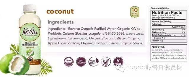根据产品风味的不同,KeVita主要选用椰子水或反渗水进行发酵,这样特殊的发酵过程,产生了一些特殊的益生菌。然后,再加入椰子水,有机水果浆或者冷压植物提取物赋予产品不同的风味,采用零热量的甜菊叶作为甜味剂。这样,一款充满气泡的,微甜的益生菌饮料就诞生了。