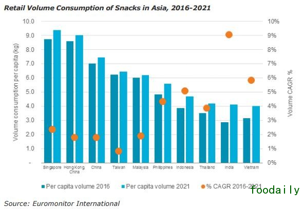 亚洲十个国家/地区2016-2021年零食销售预测。图片来源:Euromonitor International