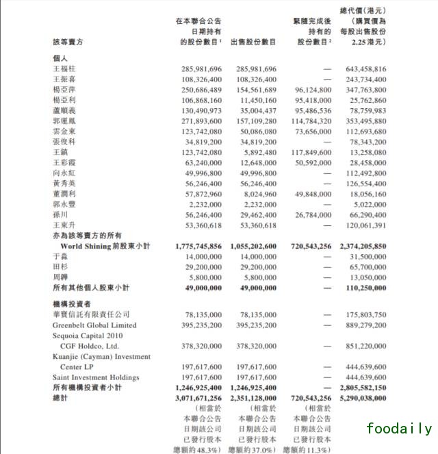 小食代留意到,今年1月24日,圣牧发布公告称其控股股东World Shining将按每股2.2港元,向Nong You Co.,Ltd.出售15.25亿股旧股,占当时已发行股本的24%,总代价为33.55亿港元。