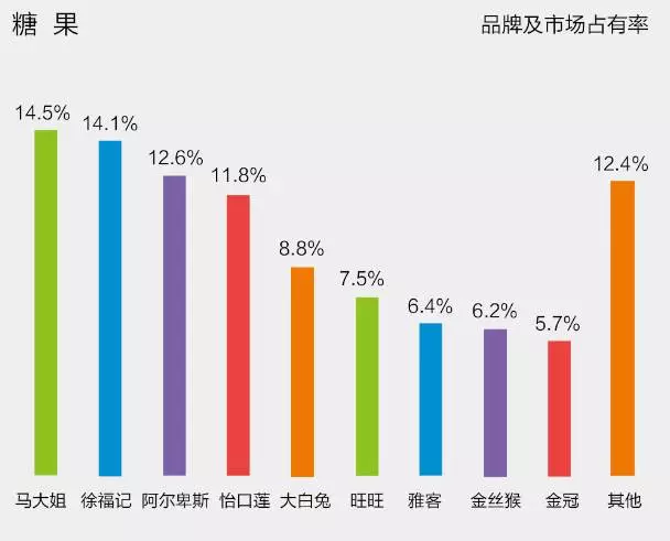马大姐(14.5%)、徐福记(14.1%)、阿尔卑斯(12.6%)位列北京及周边市场的前三位。本调查周期,婚庆用糖迎来了销售高峰,以马大姐、徐福记、阿尔卑斯等为代表的糖果企业纷纷从喜庆包装、特色陈列上下足了功夫。根据消费调查显示,有68.73%的消费者,倾向于消费时尚、个性的糖果产品。