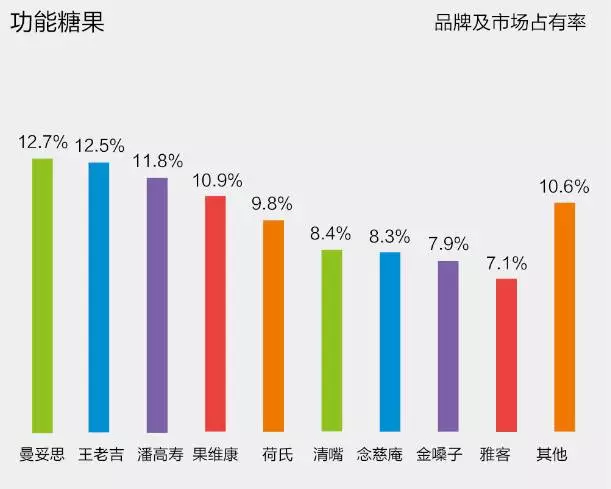曼妥思(12.7%)、王老吉(12.5%)、潘高寿(11.8%)等润喉糖品牌,位居北京及零售渠道功能糖果市场前三位。本调查周期,王老吉润喉糖产品市场占有率大幅攀升。从消费趋势分析,目前功能糖果市场品类繁多,消费者更倾向于无糖、健康的功能糖产品。