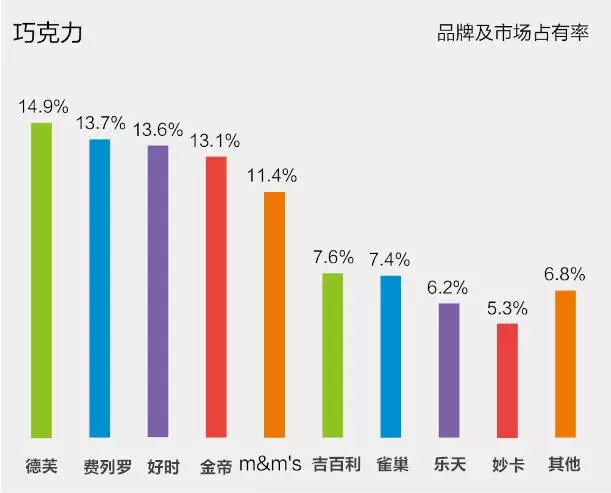德芙(14.9%)、费列罗(13.7%)、好时(13.6%)占据北京及周边零售渠道上的前三位。本调查周期,亿滋旗下明星巧克力品牌妙卡大举进入北京市场。在北京及周边地区的各大商超卖场内,以投放巧克力专柜、特色陈列区的方式来吸引消费者眼球,在母品牌亿滋的渠道影响力下,妙卡短时间内顺利完成了铺市,成为了下一个“搅局者”。