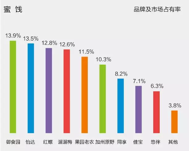 御食园(13.9%)、怡达(13.5%)、红螺(12.8%)占据了蜜饯市场前三的位置。本调查周期,各大品牌的占有率并无大幅度波动。以果园老农、加州原野等为代表的企业主打的加州西梅产品市场热销。从消费趋势来看,有66.17%的消费者表示,蜜饯产品是否低糖、低盐是决定其购买的主要原因。