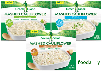 菜花泥产品,包括橄榄油+海盐、切达奶酪+培根、大蒜+草药,每半杯含有一整棵菜花,热量比传统的土豆泥低40%到45%。