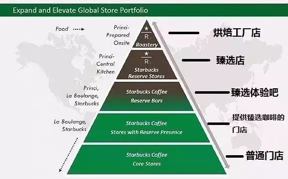 事实上,星巴克需要与麦当劳站到不同的跑道上,否则最终只会演变为两者开店数量的比拼,而其策略之一,就是通过店铺的金字塔式铺设来强化品牌认知——