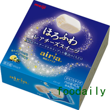 “明治 airia”系列有7种浆果混合风味。在北海道产的天然奶酪(添加量75%以上)中混合加入了洋酒、砂糖,以奶酪中包裹细小气泡所产生的“轻柔软融”为特征口感。使用非热法工艺保留了乳酸菌活性。如同零食一般的单独包装也十分考究。扩大了奶酪甜点的市场,还将以40-60岁的家庭主妇为主要目标客户进行宣传推广。