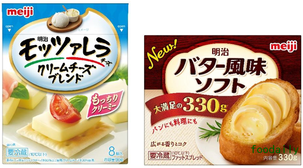 此外,“莫苏里拉奶油奶酪混合奶酪 8块装”(上图左,90g・325日元)也将以软糯的口感作为冷盘小吃推出。随着时间转变,口味较为刁钻的顾客也会给予好评的浓郁型人造黄油“明治黄油风味SOFT 330g”(上图右,300日元)也已上市,足够满足对于大容量型黄油产品的需求。
