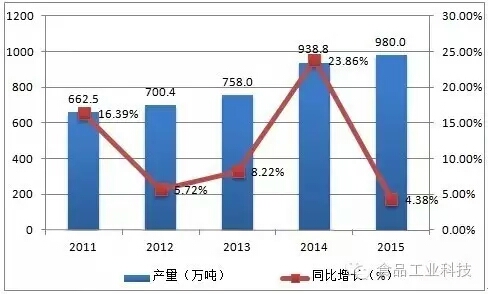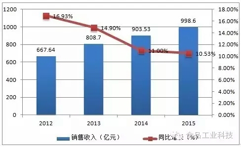 2012-2015年中国酱油食醋及类似品销售收入及增速
