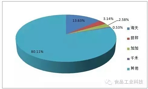 酱油行业内海天占据龙头地位,2015年,海天酱油产量占全国酱油产量的13.63%。渠道上占据广东市场20-25%的市场份额,覆盖全国市场2000多县市,尤其华东地区市场占有率较高,厨邦酱油占据广东20%的市场份额,省外竞争力偏弱,加加强势区域在华中的湖南地区;李锦记占据高端酱油,海天高端占比也不断提升,厨邦以中高端为主。