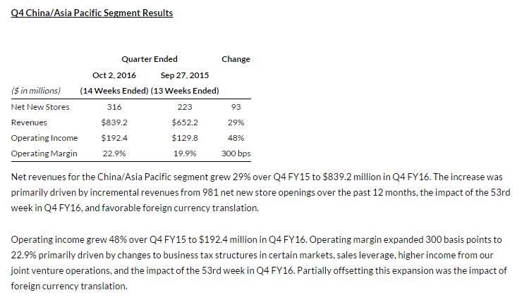 此外,上一季度星巴克在中国及亚太区市场的利润扩张主要是由于中国的营改增政策、消费增加以及合资公司运营所带动。