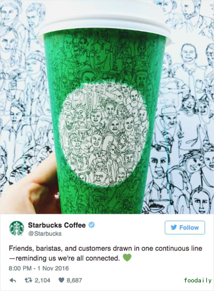 “朋友,咖啡师和消费者都用一笔线条画成了——提醒我们彼此相连。”星巴克的官方 Twitter 说。