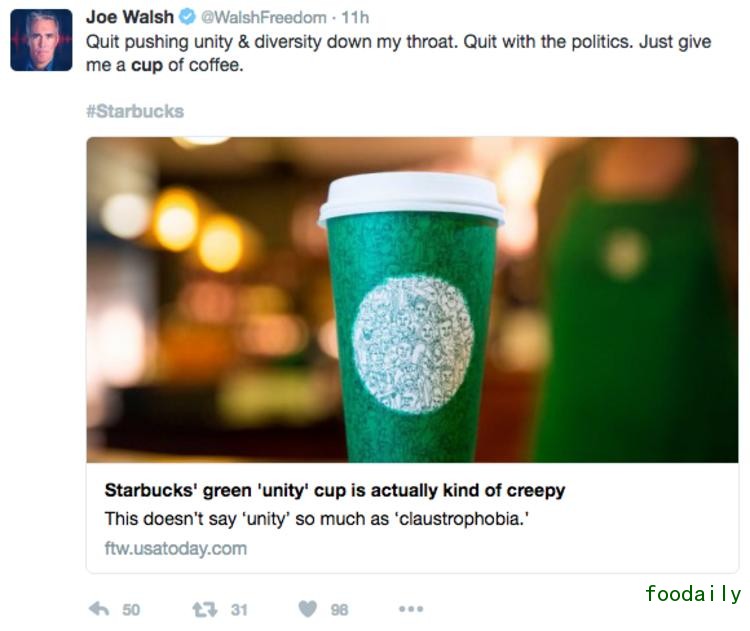 “@Starbucks,停止灌输你自由派的那套胡说八道,好好卖咖啡吧。作为一个忠实消费者,我被你强行灌输的议程给恶心到了。”@ArchieBunker19 说。