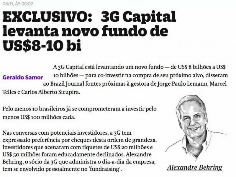 这篇名为《3G资本正在募集80亿-100亿美元》的报道引述接近3G资本总经理的人士表示,这次募资是希望能够联合其他投资者一道收购下一个目标,至少10个巴西人参与到这个投资中去。