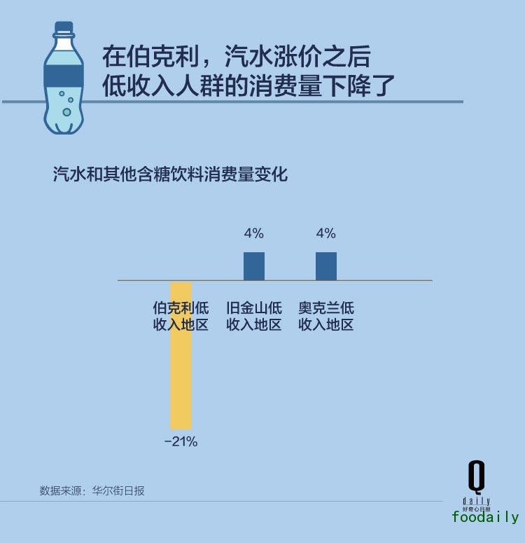 在伯克利通过了同样是每盎司一美分的汽水税之后,2015 年 4 月至 8 月期间,低收入地区汽水和其它含糖饮料消费量下降了 21%。作为对比,同一时期,旧金山和奥克兰的低收入地区,这类饮料的消费量上升了 4%。