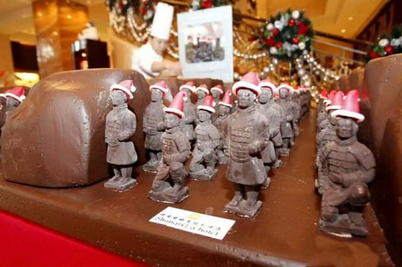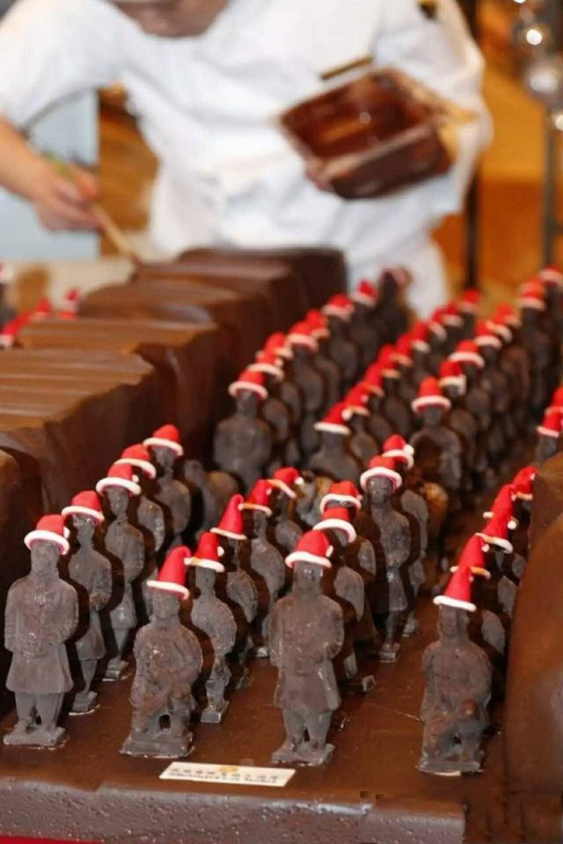 在西安香格里拉大酒店一楼大堂,一座由巧克力制作的近300个形态各异的圣诞秦俑和战马组成的秦始皇兵马俑一号坑微缩景观非常抢眼。