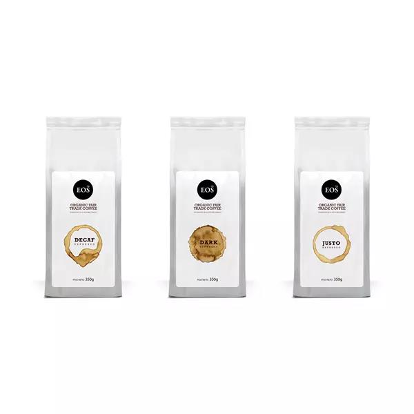 如何用最简单的方式表现出咖啡的风味?西班牙 Noem9 Studio 选择了被人们视为麻烦存在的咖啡渍,将概念品牌 EOS 的三种口味以一种直观的方式呈现出由清淡到浓郁之间的变化,简洁又很讨巧。