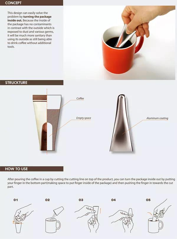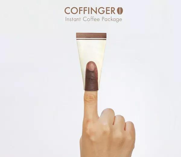 泡咖啡免不了搅拌的动作,如果没有搅拌工具又该如何是好呢?设计师 Jaeyong Lee 为此带来了名为 Coffinger 的速溶咖啡包装,它的特别之处在于尾部为手指预留的空档,外包装上也相应地印有农民的手指。从顶端撕开包装倒出咖啡粉之后,将包装沿着手指翻过去,内部干净的一面就变成了咖啡勺,同时也不用再担心粉末没有倒干净的问题了。