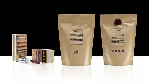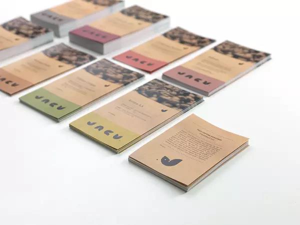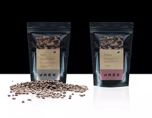 成立于 2011 年的 Jacu Coffee Roastery 是挪威奥斯陆一家专营南美鸟屎咖啡(Jacu Bird Coffee)的咖啡馆,由 Kind 负责形象设计。为了突出咖啡的特点,出现在各类物品上的 logo 就是以类似咖啡豆和小鸟的粗字体呈现的。在店内现场购买的咖啡豆包装和袋子都采用了牛皮纸搭配版画印刷的形式,漂亮的蜡封更是起到了点睛的效果。(如果你喜欢 Kind 的设计风格,还可以看一看这款烈酒包装。)