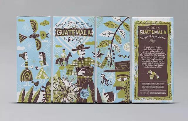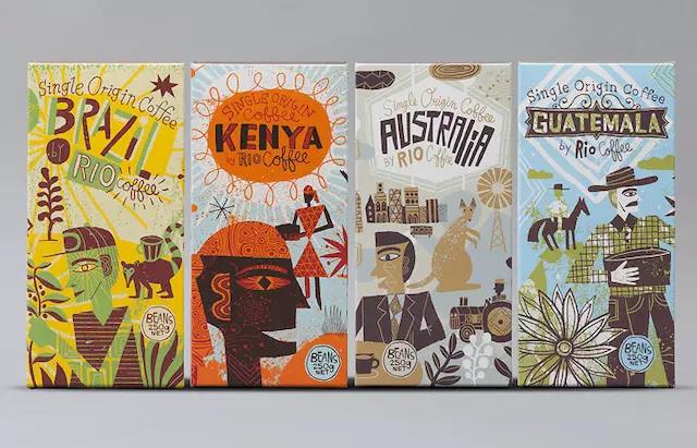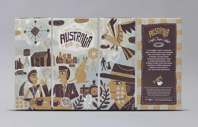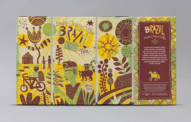Rio Coffee 来自澳大利亚,产地多元的豆子是它的一大招牌。为了突出原产地的特色,负责包装设计的 Voice Design 委托美国艺术家 Nate Williams 绘制了四组色彩鲜艳的插画。Williams 那极具个性的画风赋予包装很强的存在感,生动地呈现出了各地的风土人情,而咖啡的背景故事则安排在了盒子的另一侧,排版看起来也相当精简有趣。