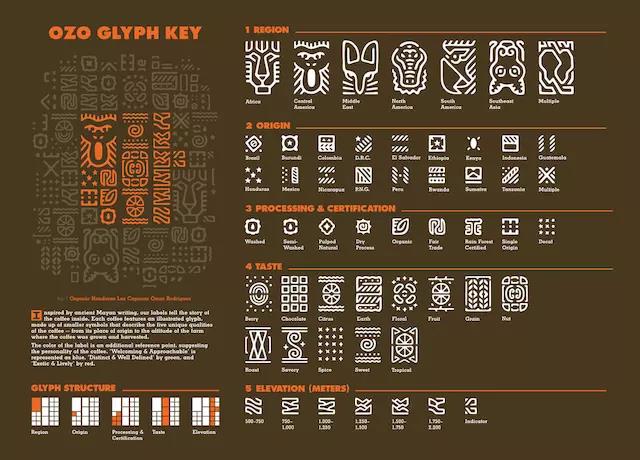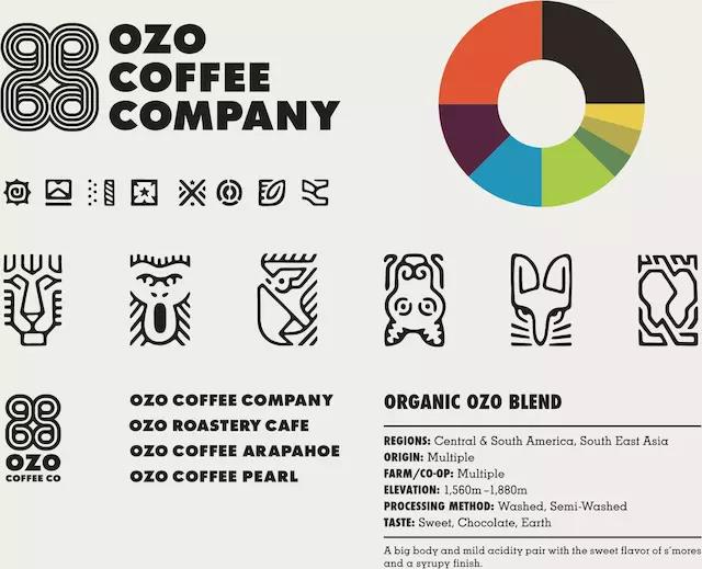 如果一个咖啡品牌有 30 种以上的拼配组合,要清楚地分辨它们可不是件容易的事。Good Apples为美国咖啡公司 OZO 出的主意相当有趣:设计师们不仅创作了 50 多个各具特色的象形文字,还设立了对应的排版规则。在这个系统的帮助下,顾客在挑选的过程中也被普及了每一款咖啡的背景资料。由于组合实在是有点多,设计师们最后又将它们按照口味分为三种大类,对应蓝绿红三色,让包装显得更加生动活泼。