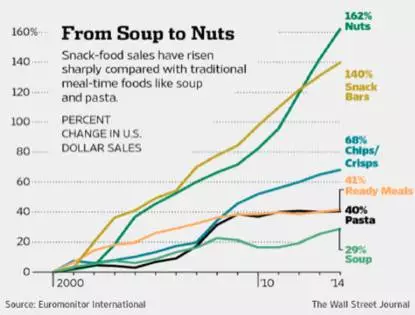 特别在进入21世纪以后,美国零食的增长速度远远超过了正餐。根据华尔街日报,我们可以看到,从2000年到2014这15年之间,薯片、坚果和snack bars的销售增长率分别高达68%、140%和162%,传统正餐食品例如汤和意大利面条的增长率仅有29%和40%。