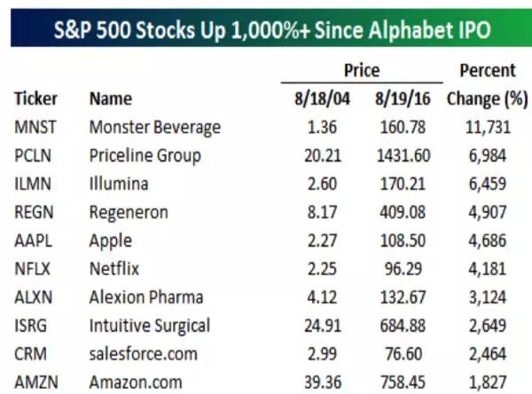 图3 谷歌上市(2004)以来S&P中增长在1000%以上的股票