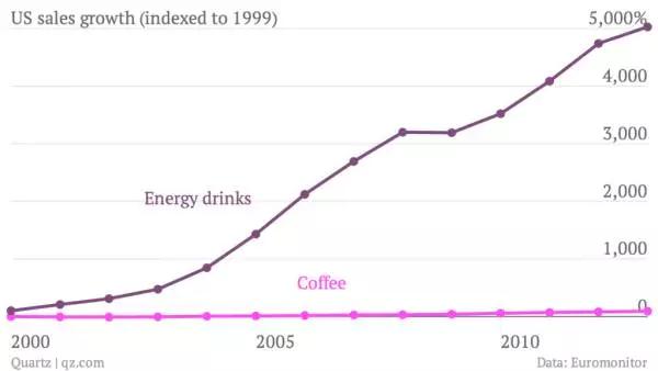 没有一个地方的增速比美国市场更疯狂。能量饮料在美国的销售,自1999年以来,已经增长了50倍以上;