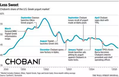 Chobani成立于2005年。2007年它推出希腊酸奶 – 纯天然,不含防腐剂的脱乳清酸奶。同期,希腊酸奶在酸奶整体市场中份额不到1%。5年后,Chobani销售额达到10亿美元,被 FasCompany评为全球最具创新50家公司之一,创造了美国零食史的一个奇迹。2012年巅峰时期,Chobani占美国希腊酸奶市场近60%份额。