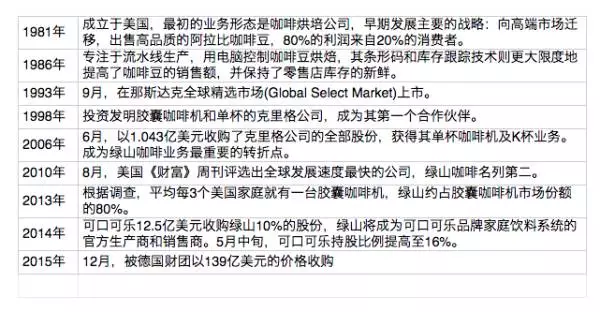 绿山咖啡(Green Mountain Coffee Roasters) 1981年成立于美国,在实现公司转型之前,绿山咖啡的主营业务是出售咖啡豆。2006年,绿山咖啡收购了发明胶囊咖啡机的克里格公司,获得其单杯咖啡机及K杯业务,成为绿山咖啡业务最重要的转折点。同一时期,绿山咖啡股价3美元左右,2011年9月为111美元,5年间累计涨幅达到36倍。2015年12月,被德国财团以139亿美元估值收购。