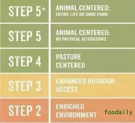 比如肉类产品,一共有6个评估级别,评级1为最基本级别,“1”的标准包含不可以有抗生素,生长激素,还必须满足在没有笼子、没有拥挤的环境下饲养、每天必须检测饲养环境的空气质量、喂养饲料的情况等。
