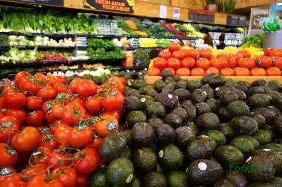 其他常见的食品,如番茄等,也被精心摆放,并配以特效灯光,也增加了顾客购买欲