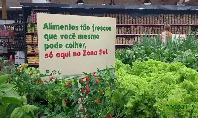 为了向顾客证明自己的蔬菜非常新鲜,巴西的连锁超市 Zona Sul 把位于里约热内卢旗舰店的蔬菜货架变成了“新鲜菜园”,顾客们可以自己动手摘取生菜、罗勒、辣椒、葱等等蔬菜。