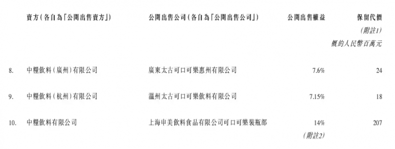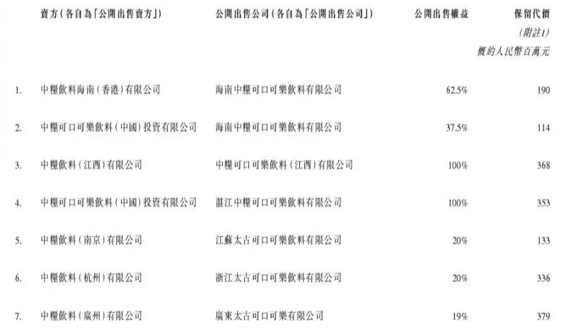 中粮旗下中国食品的公告的内容也类似,并给出公开出售股权的公司等信息。据中国食品介绍,在公开出售产权转让总合同项下潜在出售事项交割后,海南中粮可口可乐饮料有限公司、中粮可口可乐饮料(江西)有限公司及湛江中粮可口可乐饮料有限公司各自将不再为它的附属公司。
